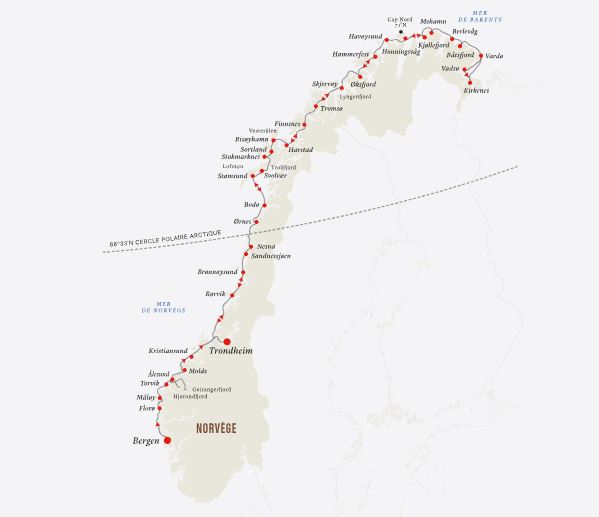 C’est à Kirkenes que votre croisière le long de la côte norvégienne change de direction et que le navire prend la direction du sud. Plusieurs des lieux que nous avons parcourus de nuit seront désormais visibles de jour.