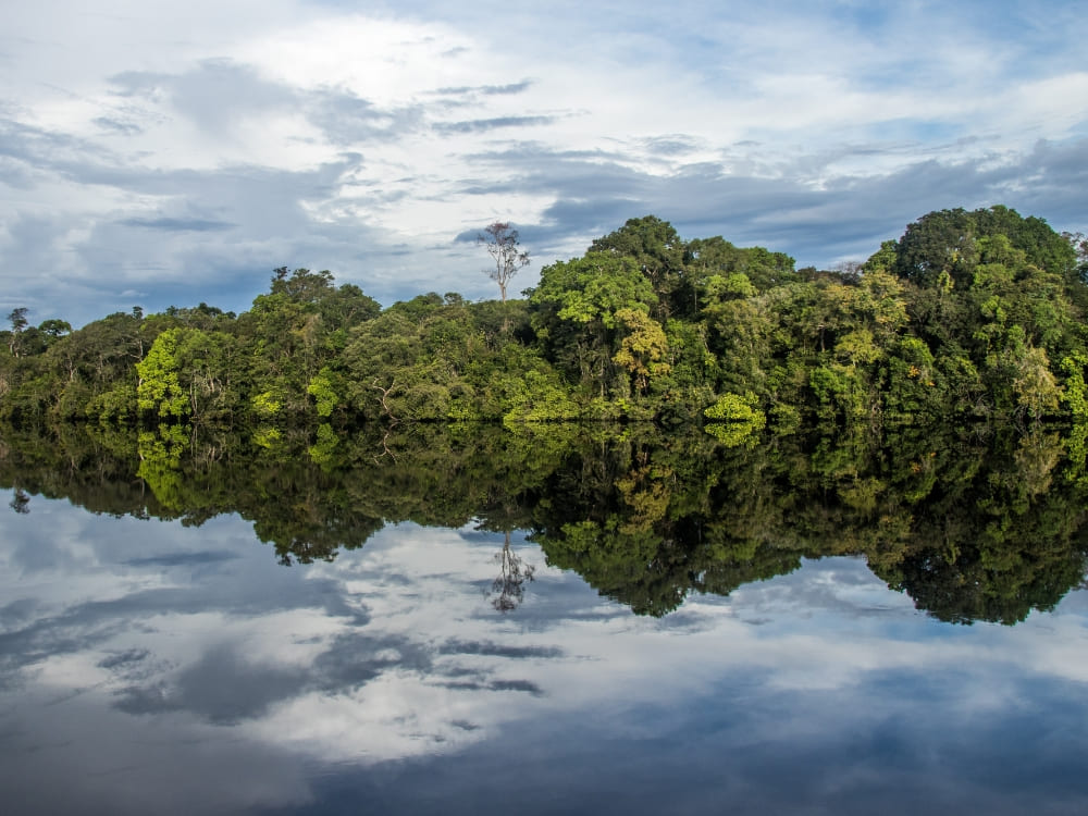 Dès le lever du soleil, c’est toute la magie de la forêt amazonienne qui se révèle : les reflets des arbres et du ciel dans l’eau, l’envol bruyant des oiseaux, la vie quotidienne et son lot de pirogues. Vous observerez le phénomène remarquable de la « rencontre des eaux » ou « Encontro das àguas » : celles du Solimões — nom donné à la partie brésilienne du fleuve Amazone avant sa confluence avec le Rio Negro —, jaunes et chargées d’alluvions, rencontrent celles du Rio Negro, sombres et acides. Elles s’entrelacent sur près de 80 km, dessinant une dentelle avant de se fondre dans le grand fleuve Amazone. Dîner et nuit à bord.
