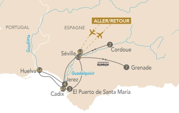 Selon votre ville de départ, vous retrouverez votre accompagnateur à Paris, à l'aéroport, ou directement à Séville. À votre arrivée, vous profiterez d'un déjeuner aux saveurs andalouses dans un restaurant local, l’occasion de commencer ce voyage sous le signe de la découverte et de la convivialité. Vous profiterez ensuite d'une visite guidée du Parc María Luisa, un écrin de verdure bordant les rives du Guadalquivir. Vous explorerez les allées d’orangers et de palmiers menant à l'emblématique Place d'Espagne. En fin de journée, vous embarquerez à bord du MS La Belle de Cadix, votre havre itinérant pour les jours à venir. Vous profiterez d'un cocktail de bienvenue ainsi que d'une présentation de l’équipage.