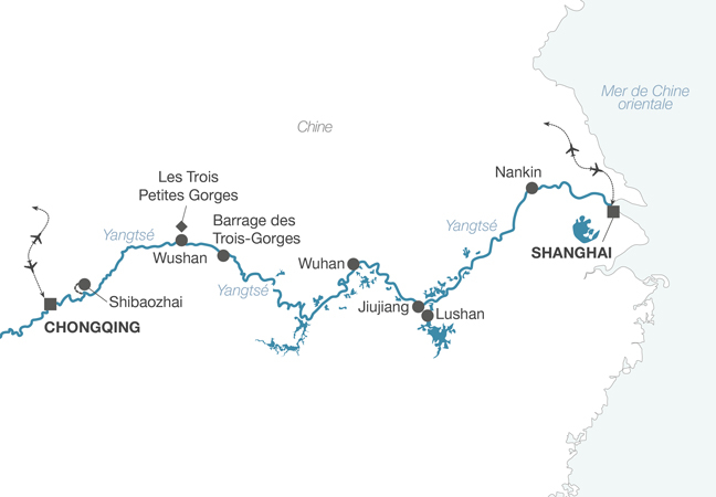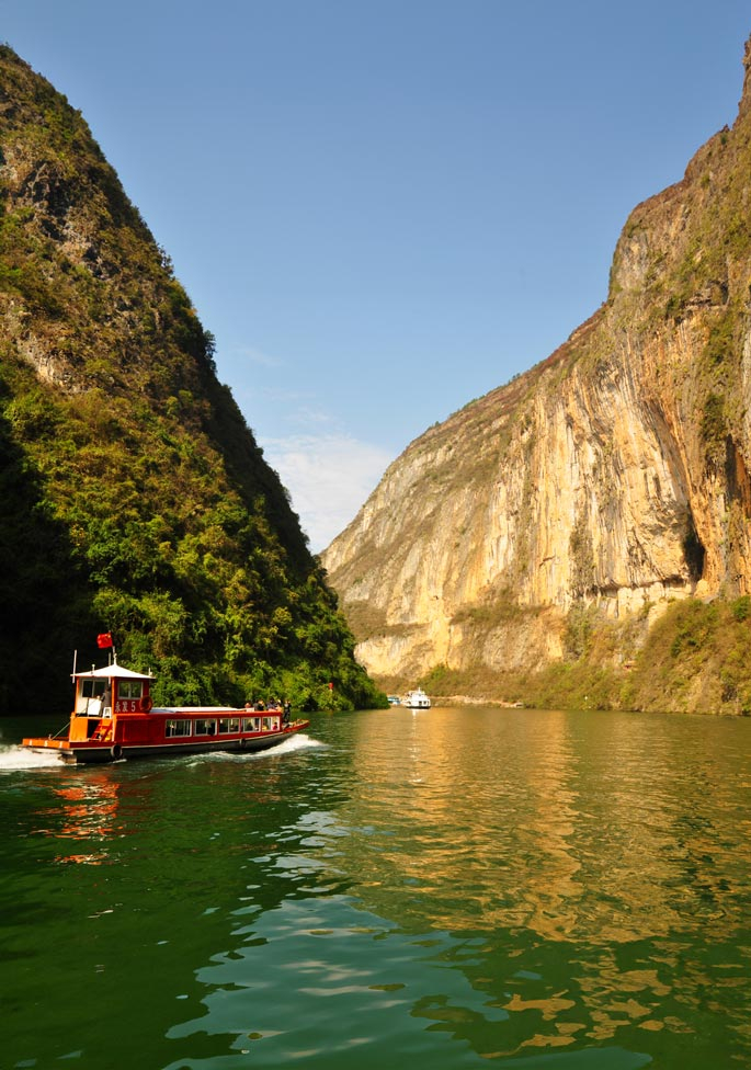 Tôt le matin, passage de la gorge de Qutang, la plus courte et la plus étroite des Trois Gorges. Débarquement à Wushan et découverte, à bord de sampans, des Trois Petites Gorges de la Daning, un affluent du Yang Tsé. Au fil de la navigation, se découvre un paysage extraordinaire composé de pics, de collines verdoyantes où jouent les singes dorés, et de cascades. Les falaises semblent à portée de main et sur les parois, les cercueils suspendus du peuple Ba témoignent d’une présence humaine millénaire. Déjeuner à bord. En début d’après-midi, passage de la gorge de Wu, célèbre pour ses versants abrupts et ses pics aux noms inspirants : pic de la Déesse, du Phénix volant, du Dragon grimpeur. Puis, passage de la gorge de Xiling, la dernière et la plus longue des Trois-Gorges. Elle est en réalité composée d’une série de sept gorges aux pics et aux rochers austères. Arrivée au grand barrage des Trois-Gorges en début de soirée. Passage du gigantesque escalier d'écluses à 5 niveaux dans la soirée et la nuit. Dîner et nuit à bord.