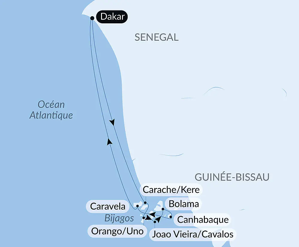 À une vingtaine de kilomètres au large du continent africain, l’archipel bissau-guinéen des Bijagos est réputée pour l’abondance de sa biodiversité. La richesse de sa faune et de sa flore marines lui a valu le statut de Réserve de biosphère reconnu par l’Unesco : dauphins, tortues vertes, singes, antilopes rayées et des centaines de milliers d’oiseaux migrateurs y trouvent refuge. L’île d’Orango, composée de cinq îles et de plusieurs îlots, est la plus grande et la plus mystérieuse de l’archipel. Son parc national et son aire marine protégée sont au cœur de la Réserve de biosphère. Lors de vos sorties en zodiac, vous partirez à la découverte de cet environnement préservé où vivent les Bijogos, véritables gardiens de ce sanctuaire.