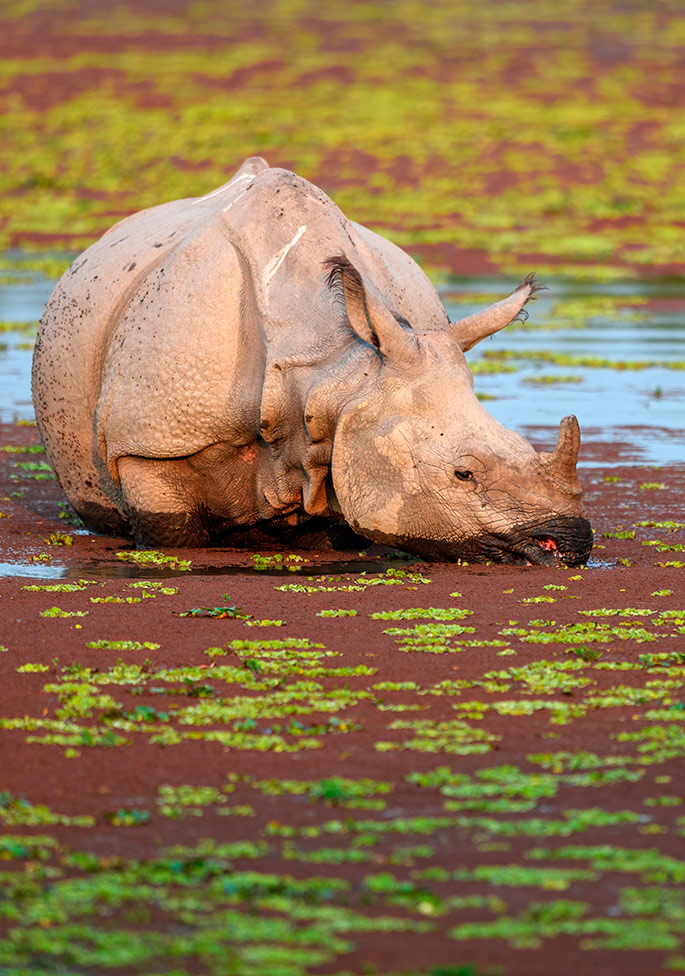 Tôt le matin, départ en jeep pour une première immersion dans le parc national de Kaziranga. Cette réserve est inscrite sur la liste du patrimoine mondial de l’Unesco. Il est notamment célèbre pour son importante population de rhinocéros unicornes ainsi que pour la densité de ses tigres. On y trouve aussi des éléphants, et des buffles d’eau. Arrêt dans une maison de thé. Le déjeuner est servi dans un restaurant local pour apprécier la cuisine locale. La visite du parc continue avec une seconde immersion en jeep. Retour à bord en fin d’après-midi. Dîner et nuit à bord.