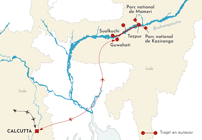 Le matin, transfert à l’aéroport de Guwahati et envol pour Calcutta. À l’arrivée, déjeuner au restaurant, temps libre (en fonction de l'horaire du vol intérieur).