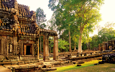 L’après-midi, visite du spectaculaire Ta Prohm. Ce temple immergé dans la végétation tropicale a été volontairement laissé dans un état proche de celui de sa redécouverte au début du XXème.