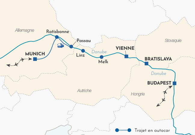 Débarquement à Passau. Transfert en autocar privé en autocar à Ratisbonne, et tour de ville de cette cité de charme qui abritait jadis la diète d’Empire. Elle peut légitimement s’enorgueillir de son Hôtel de Ville et de ses demeures patriciennes mais aussi de sa cathédrale gothique dont le chœur d’enfants est mondialement célèbre. Transfert à l’aéroport de Munich. Envol sur vol régulier, avec ou sans escale.