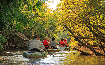 Départ en canoë motorisé, puis continuation en kayak afin de glisser en silence sur la rivière Indillama, dont le nom signifie rivière du paresseux. Cet affluent du Rio Napo, réputé pour sa riche flore et sa faune variée, offre l’occasion privilégiée d’une immersion respectueuse pour observer la vie sauvage : loutres géantes, tortues d’eau ou l’extraordinaire papillon morpho bleu. Retour à bord pour le déjeuner. En fin d’après-midi, promenade à la tombée de la nuit pour tenter de surprendre quelques espèces nocturnes.