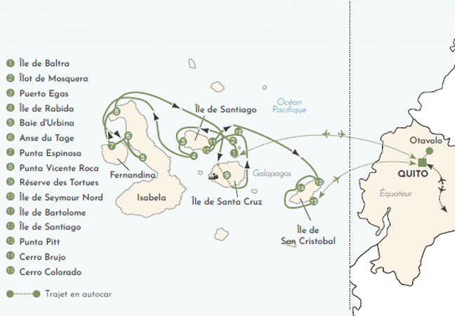 Le matin, transfert à l’aéroport de Quito et envol à destination de l’île de Baltra (Galapagos). À l’arrivée, transfert au port et embarquement à bord du Galapagos Legend. Déjeuner à bord. L’après-midi, promenade à pied sur l’îlot de Mosquera (1h30 de marche environ). Cette petite île, formée à la suite d’un soulèvement volcanique, abrite l’une des plus importantes populations de lions de mer et d’otaries des Galapagos, venant paresser sur ses plages de sable blanc. Possibilité de snorkeling ou de baignade.