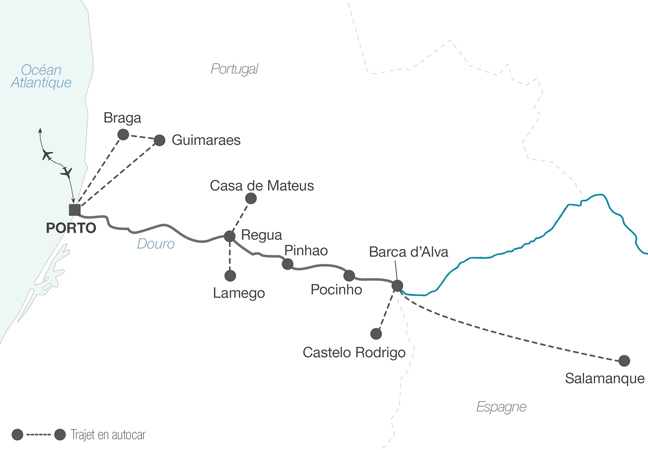 Matinée de navigation jusqu’à Barca d’Alva, à la frontière espagnole, à travers les vallées profondes et encaissées du Douro. À cet endroit, le fleuve a été élargi par ses barrages successifs qui régulent son débit et produisent une grande partie de l’électricité consommée dans le pays. Dans l’après-midi, départ pour Castelo Rodrigo. Du sommet d'une colline, ce petit village médiéval domine le plateau qui s'étend vers l'Espagne, à l'Est, et jusqu'à la vallée du Douro, au Nord. Promenade à travers les ruelles étroites et escarpées du village, dont les maisons offrent de jolies façades du XVIe siècle et des fenêtres de style manuélin.