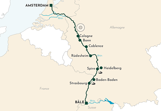 Arrivée à Cologne, la grande métropole de la vallée du Rhin. Tour de la ville en passant par son emblématique cathédrale, chef-d’oeuvre du gothique classé au patrimoine mondial de l’Unesco, son Hôtel de ville, les ruelles de sa vieille ville et les pittoresques berges du Rhin. Excursion à Bonn, l’ancienne capitale de l’Allemagne de l’Ouest. Avec son cadre idyllique sur les rives du Rhin, cette ville d’art a vu naître le célèbre compositeur allemand Ludwig van Beethoven. Visite de sa maison natale transformée en musée en 1893.