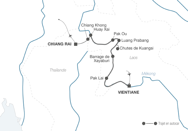 de 6 heures environ, la navigation débute à travers la vaste plaine fertile de Vientiane, puis offre des paysages spectaculaires de jungle et de montagnes au milieu desquels s’écoule un Mékong tumultueux. Déjeuner à bord du bateau traditionnel. Dans l’après-midi, arrivée à Pak Lai, ancienne ville de style colonial administrée par les Français. Sa position en a fait une escale privilégiée pour les petits bateaux naviguant sur le Mékong. Son front de rivière et son marché sont très animés. Embarquement à bord du R/V Champa Pandaw. Installation dans les cabines. Dîner et nuit à bord.