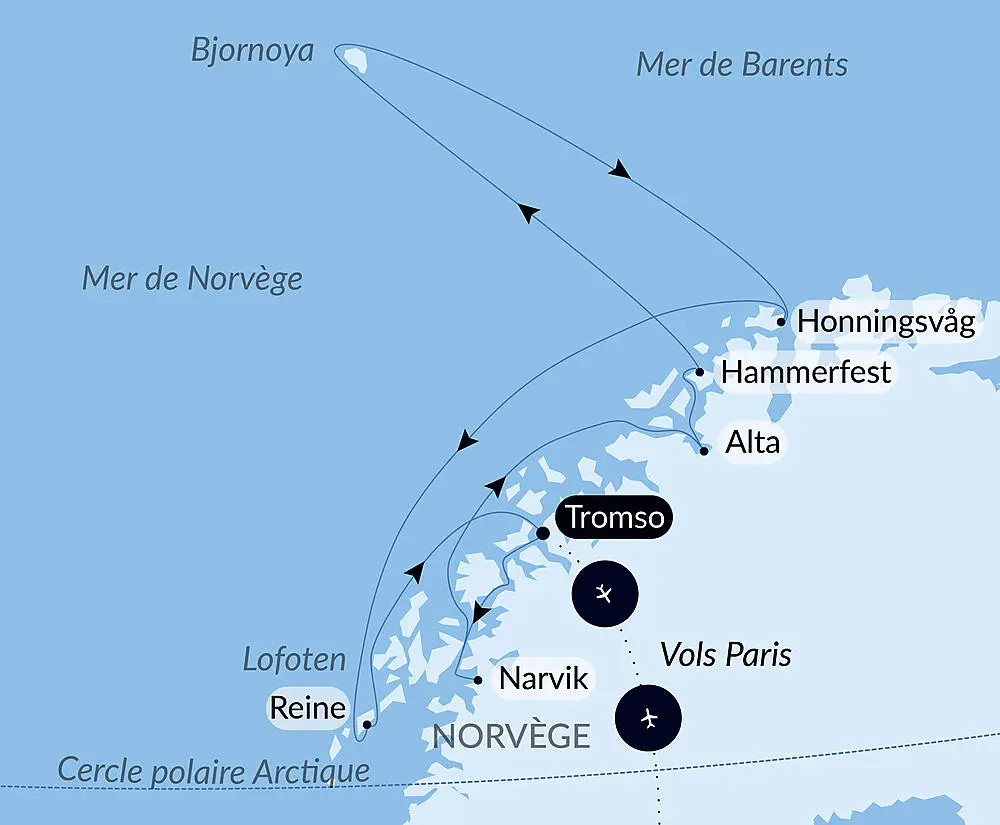 Le Lapérouse mettra à nouveau cap au sud, pour rejoindre la ravissante Honningsvag. Cette escale vous conduira jusqu’au point le plus septentrional d’Europe : le cap Nord. Sur cette falaise où se dresse l’emblématique monument en forme de globe terrestre, laissez-vous le temps de rêver face à l’immensité de la mer de Barents.