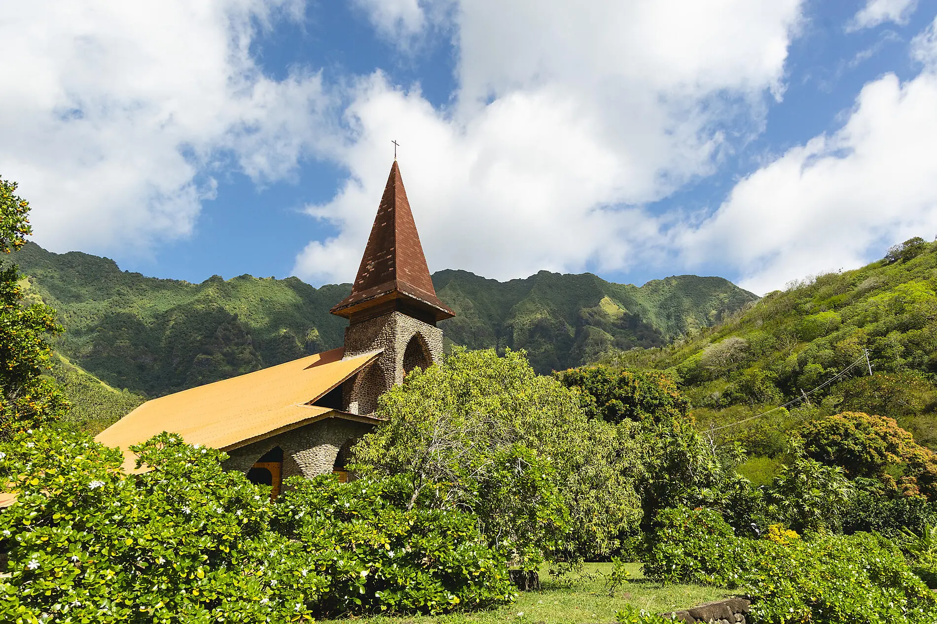 En pénétrant dans la baie d’Hatiheu, vous pourrez rapidement distinguer la statue de la Vierge, surplombant ce beau petit village à plus de 300 mètres de haut. Située au nord de l’île de Nuku Hiva, cette localité est dominée par d’impressionnants pitons de basalte. Autrefois, la peur des tsunamis et des attaques d'autres clans poussait les tribus à s'installer à l'intérieur des vallées. De ce fait, de nombreux sites archéologiques restent préservés et font l’objet d’excursions intéressantes. Vous retrouverez des places communautaires, appelés tohua, avec notamment celui de Kamuihei et d’Hikokua où vous pourrez observer plusieurs maisons traditionnelles reconstruites.