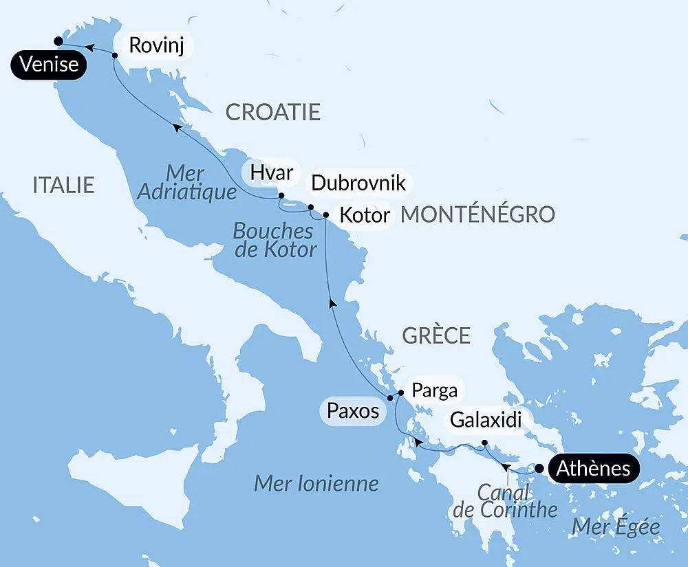 Les longs murs de la ville fortifiée de Kotor s'offrent aux regards alors que vous admirez depuis le pont de votre navire la cité médiévale enchâssée entre la mer et la falaise escarpée. Les eaux immobiles et profondes de la baie, les bancs de brume flottants ici et là créent une atmosphère irréelle et féerique. De petites îles bâties d’églises et de forteresses rappellent qu’un fier peuple de marins vit ici depuis des siècles, dans cette baie qui forme un abri naturel parfait, utilisé par les navigateurs depuis l’Antiquité. À la croisée des cultures latine et byzantine, c’est le trésor naturel du Monténégro que vous aurez le privilège de sillonner lors d’une navigation inoubliable.
