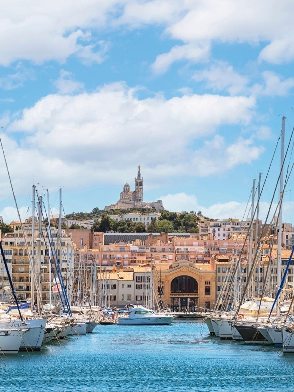 Depuis sa fondation par les Grecs en 600 avant J.-C., Marseille, ville portuaire majeure, est un carrefour de commerce et d’immigration. Au cœur du centre-ville aux charmants quartiers tel que Le Panier, se trouve le Vieux-Port, animé par les pêcheurs vendant directement leur poisson. La basilique Notre-Dame-de-la-Garde, église romane d’inspiration byzantine construite entre 1853 et 1864, localement surnommée « La Bonne Mère », surplombe la ville. La majestueuse cathédrale de la Major, située dans le quartier de La Joliette, en bordure du port, fut bâtie dans un style néo byzantin entre 1852 et 1893.
