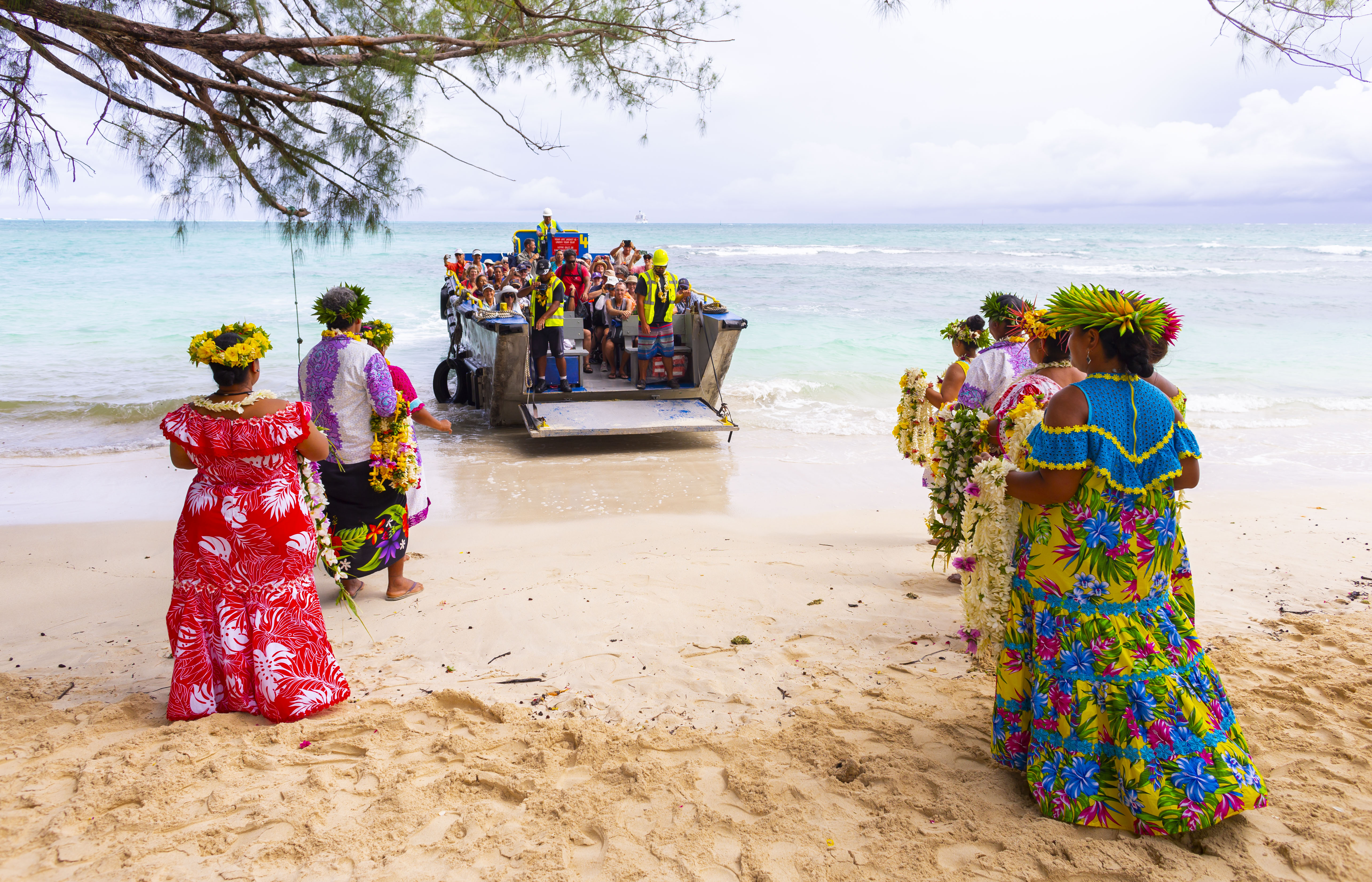 Rurutu, l’un des deux plus grands atolls surélevés de Polynésie française, est unique de part sa structure géologique qui surprend car on ne s’attend pas à découvrir de tels paysages dans le Pacifique Sud. Des falaises basaltiques et calcaires parsemées de grottes où vivaient autrefois les insulaires, un intérieur volcanique avec une jungle tropicale luxuriante, des plages de sable blanc et de magnifiques baies offrent des panoramas à couper le souffle. Rurutu est connue dans toute la Polynésie pour la qualité exceptionnelle de ses objets de vannerie, comme de magnifiques chapeaux, sacs et paniers ou tapis en feuilles de pandanus et autres matériaux naturels. L’Aranui au mouillage, au large de Rurutu, les passagers débarqueront, après un déjeuner à bord, en barges sur le quai de « Moerai » où ils seront accueillis sur une prestation de chants locaux. Profiter d’un temps libre dans le paisible village de Moerai.
