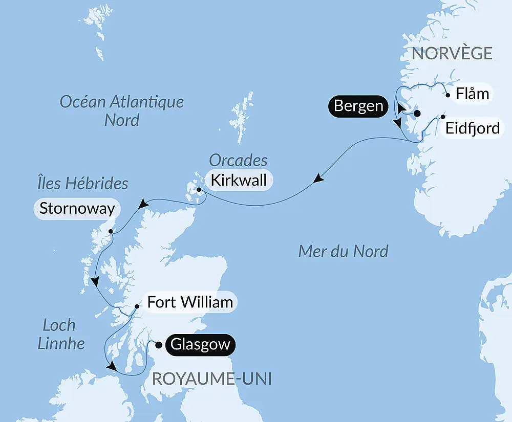 Enfin, vous rejoindrez Glasgow, la chaleureuse capitale culturelle écossaise au riche patrimoine artistique et architectural, votre port de débarquement.
