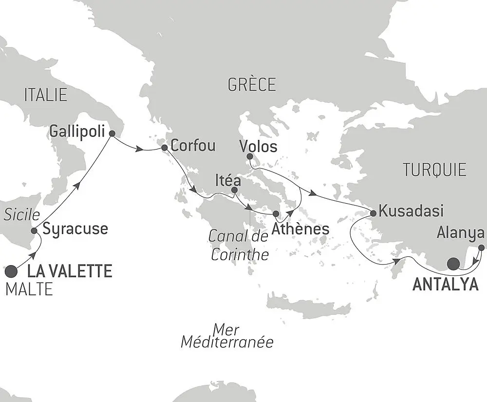 À proximité d’Athènes, Lavrio est un paisible port de plaisance accueillant des bateaux du monde entier. Cette ville est réputée depuis l’Antiquité pour les mines argentifères du mont Laurion, actrices majeures de l’essor d’Athènes et de l’économie grecque du XXe siècle. Si le temps le permet, promenez-vous dans la ville et découvrez les nombreux vestiges issus de cette industrie florissante jusqu’aux années 1980 : anciennes constructions de style néoclassique, bâtiments industriels et maisons ouvrières. Profitez également de cette escale pour découvrir Athènes et son acropole ou encore le cap Sounion sur lequel se dresse le magnifique temple de Poséidon.