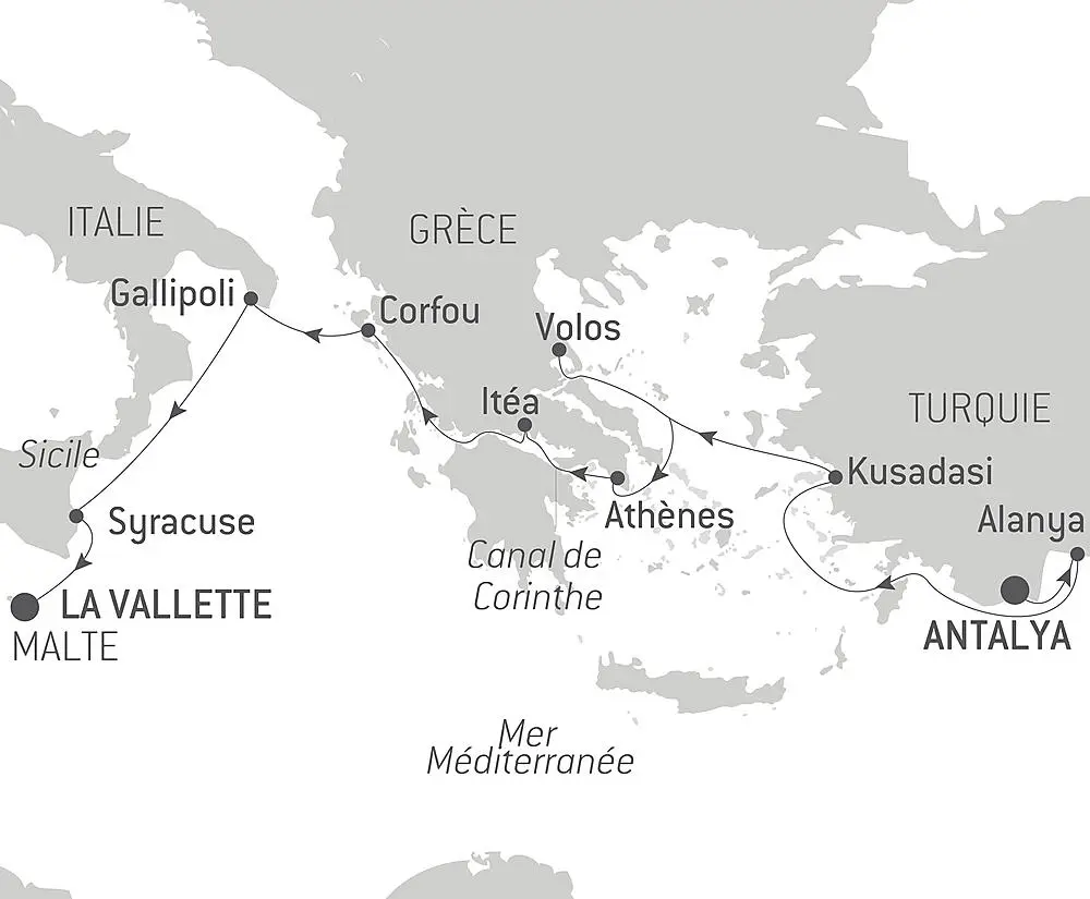 À proximité d’Athènes, Lavrio est un paisible port de plaisance accueillant des bateaux du monde entier. Cette ville est réputée depuis l’Antiquité pour les mines argentifères du mont Laurion, actrices majeures de l’essor d’Athènes et de l’économie grecque du XXe siècle. Si le temps le permet, promenez-vous dans la ville et découvrez les nombreux vestiges issus de cette industrie florissante jusqu’aux années 1980 : anciennes constructions de style néoclassique, bâtiments industriels et maisons ouvrières. Profitez également de cette escale pour découvrir Athènes et son acropole ou encore le cap Sounion sur lequel se dresse le magnifique temple de Poséidon.