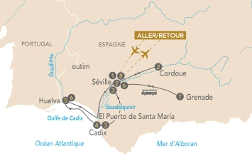 Selon votre ville de départ, vous retrouverez votre accompagnateur à Paris, à l'aéroport, ou directement à Séville. Au programme, un déjeuner aux saveurs andalouses franches et iodées dans un restaurant local. Puis, vous profiterez d'une après-midi libre. Quelques pas suffisent pour rejoindre le pont Isabel II, traverser le fleuve et se perdre dans les ruelles vibrantes où l’on croise des ateliers de céramique, des échoppes anciennes, le marché de Triana et sa halle gourmande. Idéal pour quelques douceurs locales ! Pour les plus contemplatifs, le parc María Luisa offre ses allées d’orangers et de palmiers, tandis qu’en toile de fond, les rives du Guadalquivir continuent de raconter leur légende andalouse. En fin de journée, cap sur le fleuve Guadalquivir. Vous embarquerez à bord du MS La Belle de Cadix, votre havre itinérant pour les jours à venir. Vous profiterez d'un cocktail de bienvenue ainsi que d'une présentation de l’équipage. En soirée pour les plus curieux, vous aurez le privilège de découvrir en visite privative optionnelle l’un des joyaux de Séville : l’Alcazar. Palais emblématique de l’art mudéjar, encore habité par le souvenir des califes et des rois catholiques, l’édifice se dévoile dans une atmosphère feutrée, loin des foules. Un moment rare, au cœur de la pierre et des jardins. (en option) Note : Veuillez noter que les programmes des premiers et derniers jours sont sujets à modification en fonction des horaires de vol et d'autres facteurs indépendants de notre volonté. Nous nous efforçons de minimiser ces changements et de vous informer en temps opportun