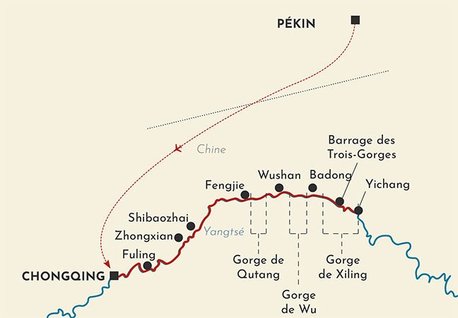 Après le petit déjeuner, débarquement du Yangzi Explorer II et transfert à l’aéroport de Chongqing pour envol vers Pékin. À l’arrivée, transfert en ville pour la visite de la Cité Interdite. Passage par la place de la porte de la Paix Céleste connue sous sa dénomination chinoise de place Tian’anmen et délimitée par la Cité interdite et d’imposantsbâtiments officiels construits au cours des années 1950. Visite des principaux palais de la Cité impériale ainsi que des jardins. En fin de journée, transfert vers l’aéroport et envol à destination de France, de Belgique ou de Suisse avec ou sans escale.