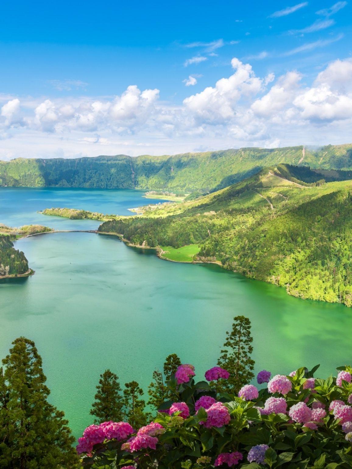 Les Açores sont situées à environ 1 360 km des côtes portugaises. Leur situation géographique dans l'Atlantique, entre l'Europe et les Amériques, leur permet de bénéficier d'un équilibre parfait entre l'isolement et les visites des explorateurs transatlantiques. A Ponta Delgada, la capitale de l’Île Sao Miguel, les célèbres portails du 18ème siècle s'ouvrent sur un certain nombre de monuments qui valent la peine d'être visités, la plupart ayant été construits entre le 16ème et le 18ème siècle : le musée Carlos Machado et les églises de Sao Sebastiao, Sao Pedro, Sao Jose, Colegio et Nossa Senhora da Conceicao, le couvent et la chapelle de Nossa Senhora da Esperanca et la chapelle Santa Ana. Les palais : Fonte Bela et Santa Ana ; Conceicao et Santa Catarina ; Casa de Carlos Bicudo et Pacos do Concelho. Parmi les autres lieux à ne pas manquer, la Caldeira das Sete Cidades (lacs verts et bleus), Lagoa do Fogo, Ribeira Grande, Vale das Furnas (spas et piscines minérales chaudes) et la Vila Franca do Campo.
