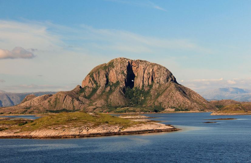 En longeant la côte du Helgeland, vous apercevrez une étrange montagne, Torghatten (culminant à 258 m au-dessus du niveau de la mer), avec un trou caractéristique en son centre. Ce trou long de 160 m, haut de 35 m et large de 20 m s’est formé au cours de la glaciation. Participez à une randonnée sur la montagne.