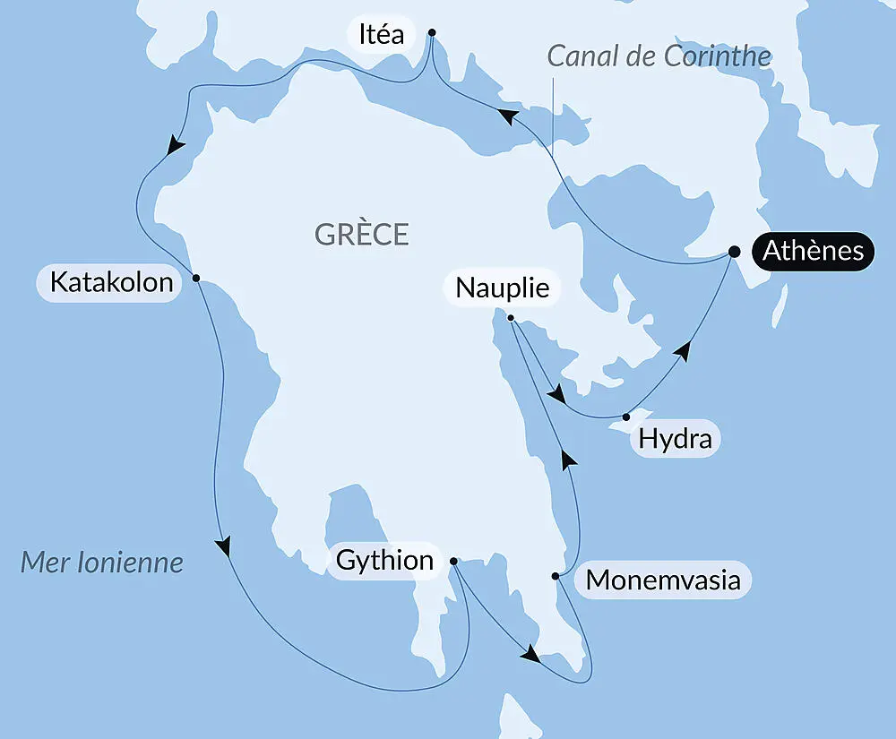 La quiétude d’une mer toujours turquoise, les collines escarpées baignées de lumière, les plaines fertiles, les océans d’oliviers et les cyprès élancés sont autant d’invitations à explorer le Péloponnèse, une terre façonnée par les mythes. Lors d'un voyage de 8 jours à bord du Champlain, partez à la découverte de ces paysages et sites archéologiques uniques. En automne, loin des foules, ces lieux de légendes semblent s’animer au gré des récits des héros grecs, des dieux colériques et des créatures antiques.