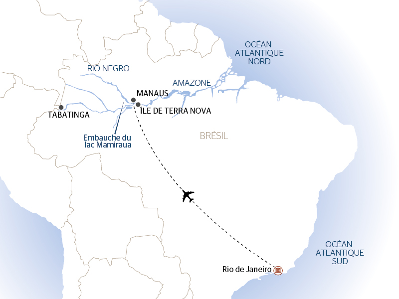 Petit déjeuner. Transfert vers l’aéroport et vol vers Manaus via Sao Paulo. Accueil à l’aéroport de Manaus et transfert vers le Brasilian Dream pour l’embarquement. Navigation vers la rencontre des eaux, un spectacle singulier, les eaux du Solimões, cours supérieur de l’Amazone, de couleur jaune, chargées d'alluvions et celles du Rio Negro sombres, dessinent sur des kilomètres une dentelle ocre et noire avant de se fondre pour devenir le puissant fleuve Amazone. Navigation à contre-courant sur le Rio Solimões. Vous pourrez observer la faune et de la flore sur les berges du fleuve. En milieu d’après-midi, sortie d’observation de la faune et de la flore en embarcation privative. Présentation de l’équipage et cocktail de bienvenue. Dîner à bord et nuit en navigation.