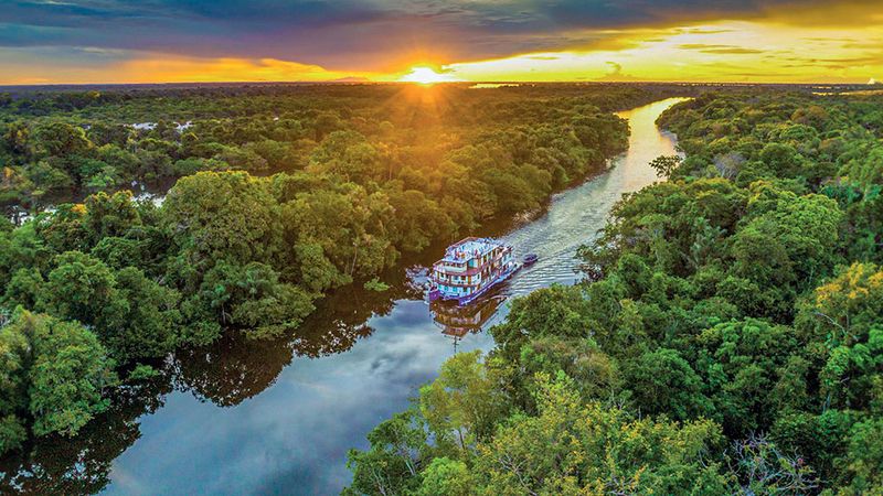 Le matin, départ en embarcation privative pour l’observation de la faune et de la flore. Sur le chemin du retour, arrêt chez un producteur d'açai qui vous présentera la culture de cette baie magique, fruit d'un palmier, riche en vitamine C et antioxydant. Puis, visite d’une charmante ville amazonienne, où l’effervescence du marché, les trésors de l’artisanat local et le quotidien animé dévoilent une culture vibrante. Vous plongerez dans son histoire méconnue, marquée par les courageux "soldats du caoutchouc" qui jouèrent un rôle clé durant la Seconde Guerre mondiale. Après-midi en navigation et observation de la vie quotidienne sur les berges du fleuve. En fin d’après-midi, profitez d’un apéritif aux couleurs du coucher de soleil et échangez avec vos guides sur les rencontres de la journée. Dîner et nuit à bord.
